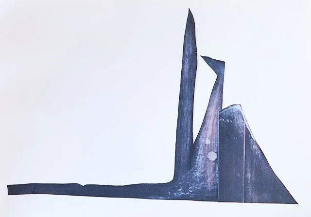 and mounted on a page in a 9 x 12 inch ring bound sketchbook. Some of the pieces, like this one is a single shape cut from a photo.