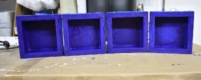 To find Franz I went looking for him in the work he had made over the course of last year. Two places you can find him on this website are Franz Painting, Part One and Franzi Blue. Three things stand out in Franzi's work: the color blue, the square, and how he quickly builds up layers of very thin acrylic paint using a hair dryer. To entice him to return I needed to bring these three elements into the next work.