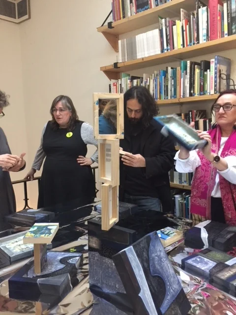 This brings me to how the work was engaged with by the group. Although I introduced each work individually and gave some information to what it was, and by whom and how it was made, within moments people began to mix the pieces up. This could have happened for a number of reasons ranging from the number of people present, the space, the number of components some of the works consist of, and, importantly, experience with a previous work [Sonata shown as part of MFA Dialogue with Claire Elizabeth Barratt and Spacebodies II in the Transart Triennale, July/August 2016 at Uferstudios, Berlin, Germany]. In the photos below you will see how part of the group first began playing with the birch wood panel paintings to create sculptural objects by stacking and leaning the individual panels on and against each other. Meanwhile, at the other end of the table another part of the group looked closely at the papers upon which Melusine had written out her poems in Sütterlin script. The work Concertinaed as I presented it I had set up on the table as a vaguely circular object, positioning it so that the ends almost touched - in the way I had played with it on a table in my studio. I noticed people immediately took it out of that position and tried to 'read it' like a book. After a few minutes a colleague with an assertive personality and who's definition of what makes a painting a painting is well known to me and with which I don't agree began to move the panels from the table and find ways to hang them around the space from the bookshelves and other protruding objects ... essentially making them fit the definition of painting espoused by the colleague. Interesting was how the others followed suit and soon the table was empty not only of the panels, but the poems of Melusine together with Concertinaed has been 'shelved' on the library bookshelves between Soma's collection! At this point the discussion began ...